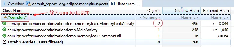 点击Histogram后,会出来一个Histogram标签,会列出APP中所有类的实例个数,感觉跟Android Studio的.hprof查看器差不多,MAT中的Objects相当于AS中查看器的Total Count。