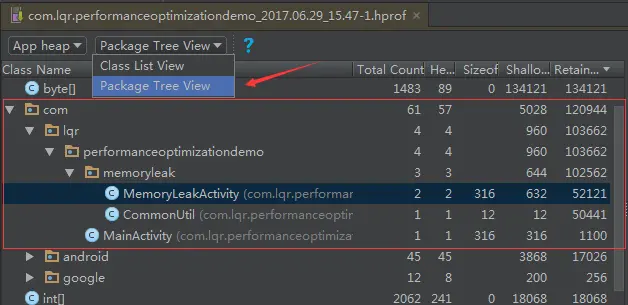 通过包名筛选,找出了我们自己写的代码,Android Studio的话可以通过切换视图来定位。可以发现MemoryLeakActivity的实例有2个,说明它可能存在泄漏,再联系之前在获取快照之前执行过GC,而这个Activity还没有销毁,说明这个Activity应该是泄漏了。好,到这里单文件分析就结束了。