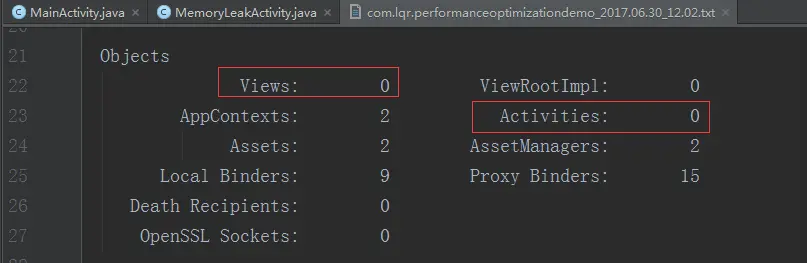 通过上述操作,会生成一个txt文本,其中就记录着View和Activity的数量。如下图所示,它们的值都为0(主要看Activities),说明本APP不存在内存泄漏。相反的,只要值不为0,那么APP是存在内存泄漏的。