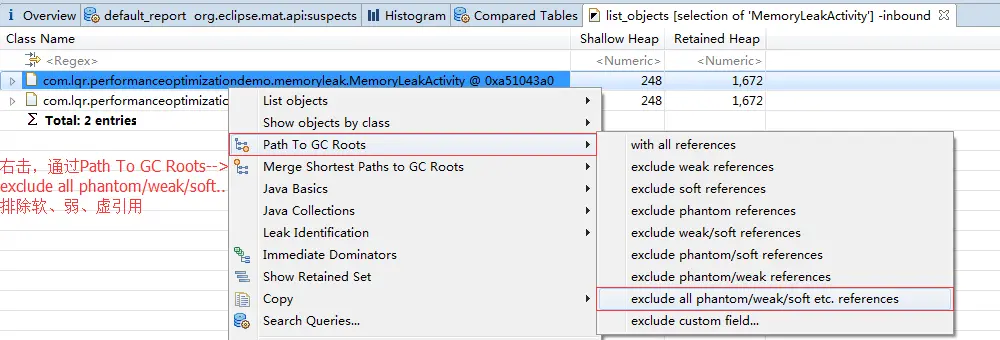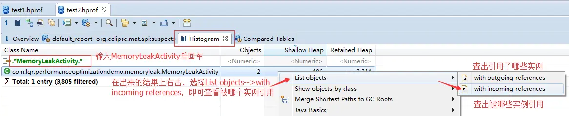 通过单文件分析或多文件分析,我们知道MemoryLeakActivity发生了内存泄漏(被别的实例引用导致无法被GC回收),所以回到test2.hporf的Histogram,筛选出MemoryLeakActivity,右击List objects-->with incoming references。