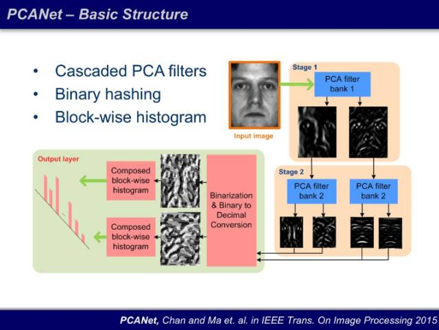 为了证明深度的必要性,我们打算先搭建一个最简单的网络结构 PCANet 做基线:两层的 PCA 筛选器,激活函数用比 ReLU 还简单的 Binary,并且直方图统计(histogram)替代均值或者最大值池化输出。结果很震惊:这个结构 15 年在 FERET 数据库上成为了当前最佳(state-of-art)。