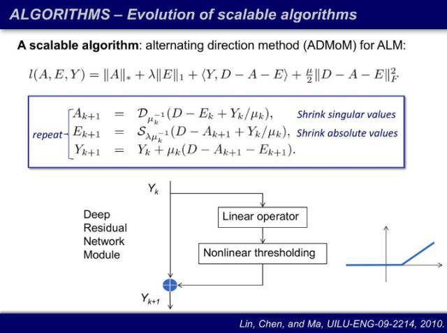 一阶算法的问题是,虽然可扩展(scalable),但是收敛速度非常慢,大概要 1 万次迭代才能收敛。因此我们首先想到特殊解:固定 A 求 E 和固定 E 求 A 都是有闭解的,我们利用临近算子(proximal operator)做阈值。我们在寻找一阶算法的时候发现,80 年代的比 90 年代的快,70 年代的比 80 年代的快,最后最快的算法是 50 年代的 ADMM(Alternating Direction Method of Multipliers),而且现在训练神经网络的也是用 ADMM 做分布和并行。这些算法快是因为当年的算力有限,数学家们还拿着计算尺在做运算。现在模型强调越大越好越深越好,是因为资源丰富了,它并不在乎效率问题了,人工、时间、计算能力,都不计成本地投入。在传统优化领域我们不是这样做的,我们将 1 万次迭代缩减到 20 次迭代。这就等价于原本要建 8000 层的神经网络,现在用了 20 层就实现了。