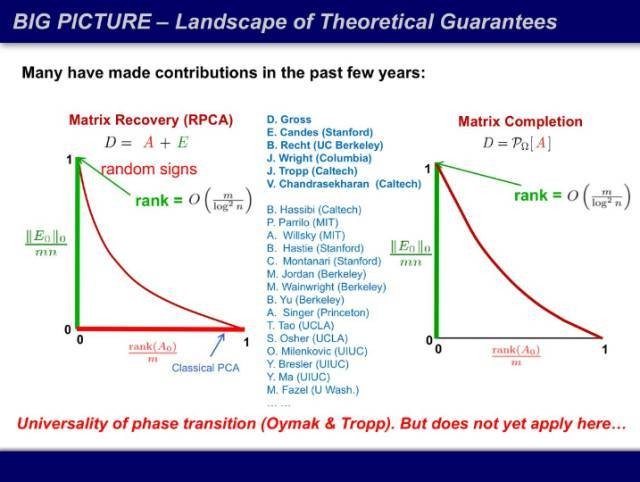 刚才的矩阵修复定理证明了下图的绿线,传统 PCA 是横轴的红线,模拟显示,红色曲线下方的区域都有效,但尚未有理论证明。