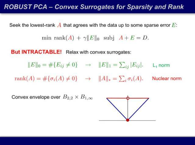 理论的突破让大家兴奋了一阵子随即冷静了下来:可计算并不等于实用。一张 1000*1000 的图片约一兆大小,D = A + E,A 和 E 都不知道时,这个优化问题的维度是两百万,而且目标函数不可导。传统凸优化方法解几百维的问题还好,数百万维的问题,参数连存都存不下。因此只能用一阶算法,不能用二阶算法。这和神经网络是一样的,你只能用随机梯度下降(stochastic gradient descent)去训练上千万个未知量。