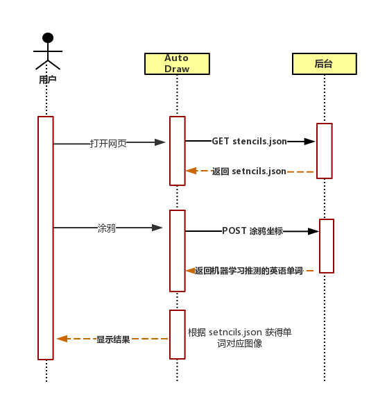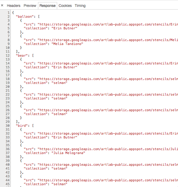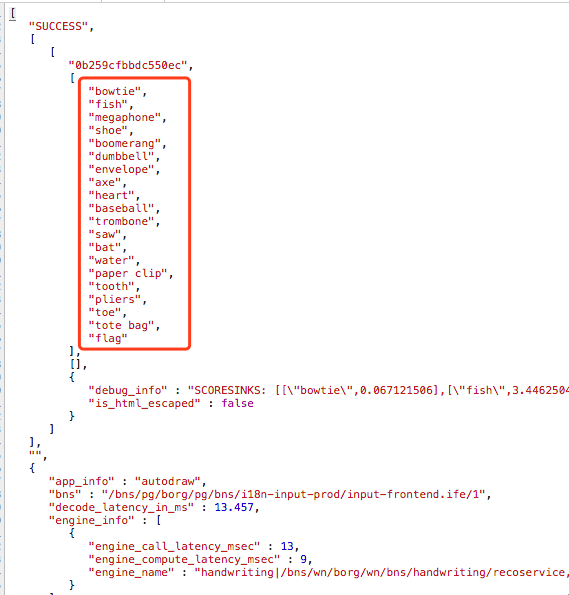 啊哈!查看请求的 Response 的就会发现这是一个英语单词及单词所对应存放在 Google storage 上图像的 JSON 集合。原来 Auto Draw 是通过这个 JSON 集合,实现了英语单词到图像的转化。通过调试,Auto Draw 整体的一个核心 API 调用流程就很清楚了。
