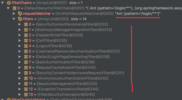由上文可知每一个security:http标签实际上对应的是一个SecurityFilterChain的类,也就是一条Filter链,可以通过其http属性指明其作用的URL,否则作用域全部的URL,如下配置,该security:http会产生一个对/login下的所有请求Filter链.
