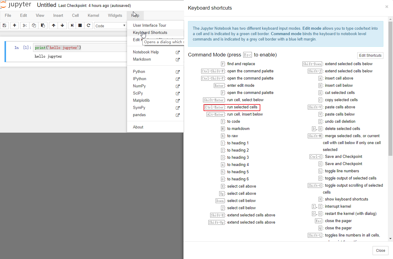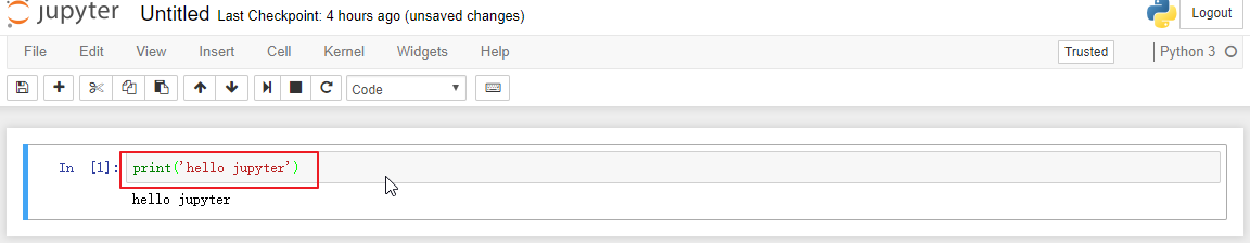 print('hello jupyter')按 Ctrl+Enter 运行,结果如下
