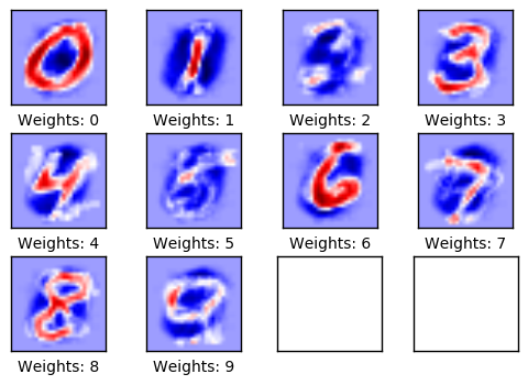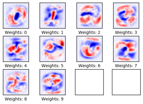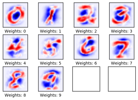 这个函数用来绘制模型的权重weights。画了10张图像,训练模型所识别出的每个数字对应着一张图。