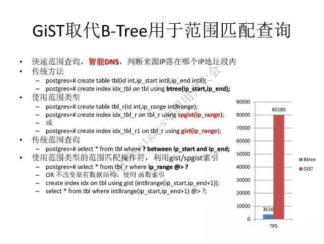传统B-Tree的查询效率比较低,而GiST可以存一个范围的数据类型,使用这个索引检索,可以达到八万TPS,性能提升非常明显。