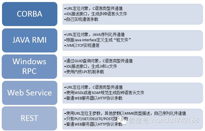 4. WebService & REST:在互联网时代,程序需要通过互联网来互相调用。而互联网上最流行的协议是HTTP协议和WWW服务,因此使用HTTP协议的Web Service就顺理成章的成为跨系统调用的最流行方案。由于可以使用大多数互联网的基础设施,所以Web Service的开发和实现几乎是毫无难度的。一般来说,它都会使用URL来定位远程对象,而参数则通过一系列预定义的类型(主要是C 语言基础类型),以及对象序列化方式来传递。接口生成方面,你可以自己直接对HTTP做解析,也可以使用诸如WSDL或者SOAP这样的规范。在REST的方案中,则限定了只有PUT/GET/DELETE/POST 四种操作函数,其他都是参数。