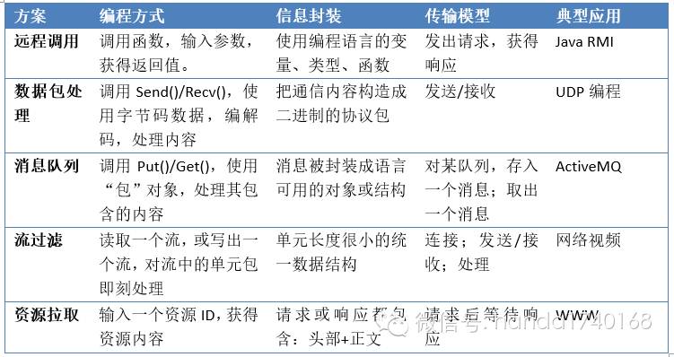 远程调用本身是网络通信的一种概念,他的特点是把网络通信封装成一个类似函数的调用。网络通信在远程调用外,一般还有其他的几种概念:数据包处理、消息队列、流过滤、资源拉取等待。下面比较一下他们差异:
