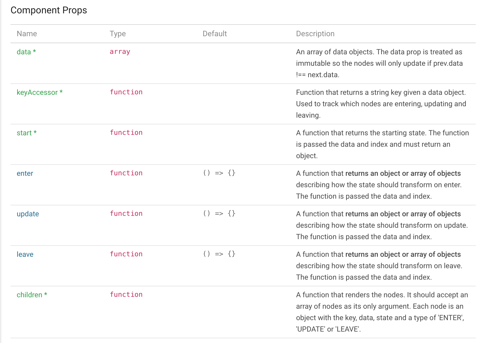 Each object returned from your enter, update and leave functions can specify its own duration, delay, easing and events independently. To support that, inside your object there are two special keys you can use: timing and events. Both are optional. Timing and events are covered in more detail below. The rest of the keys in each object are assumed to be keys in your state.