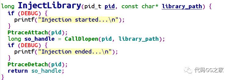 InjectLibrary讲解完成,主要完成了查找dlopen,然后传入so的文件地址,使用dlopen将其加载起来,返回handle后面再找符号需要。
