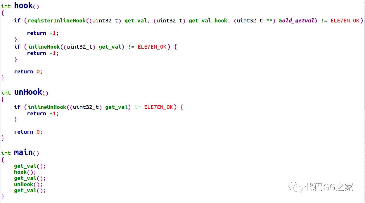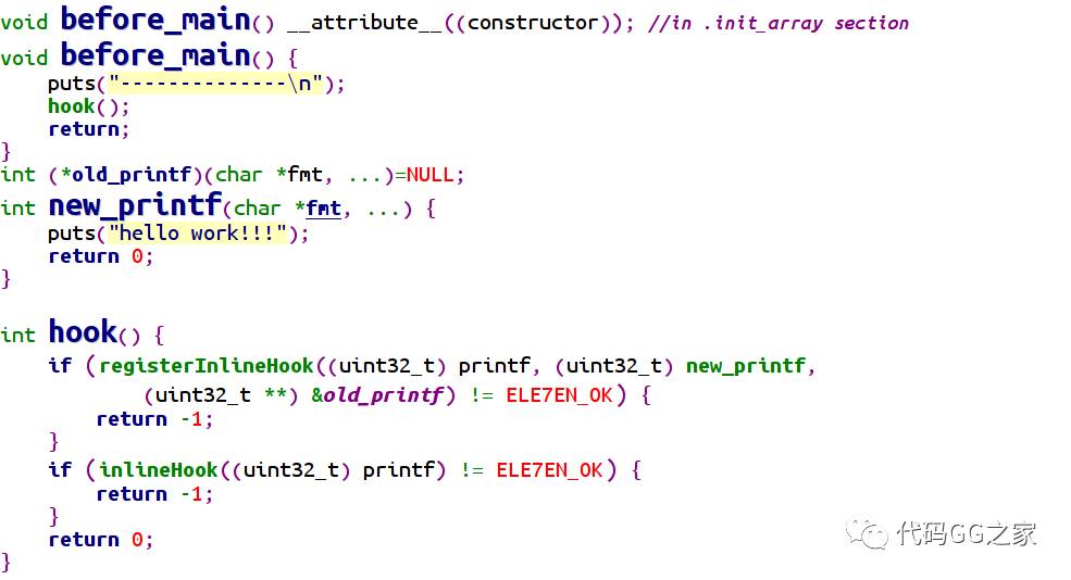 这里用到一个属性__attribute__((constructor)) ,这个标记的方法, 会在so加载之后,立即调用。于是这里就执行了before_main方法,完成hook printf的动作。由于知识点前面都讲过,因此不再烦述,读者自行领悟。
