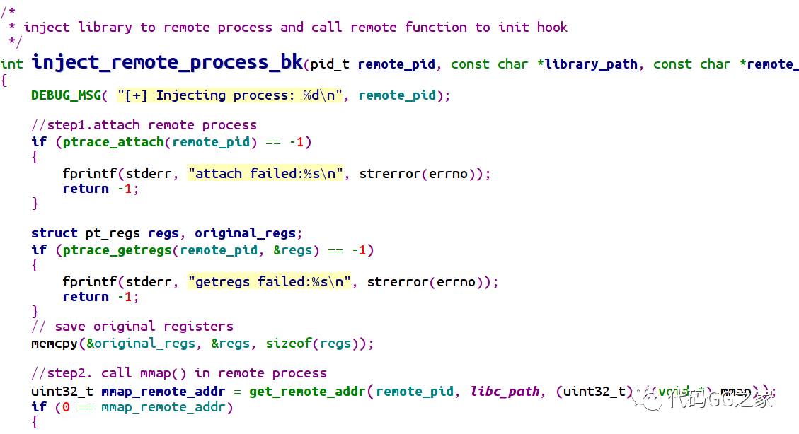 mmap_remote_addr =get_remote_addr(xxx,mmap) 去查找mmap方法在远程进程的地址(具体方法,我们本进程的mmap对应方法的地址减去mmap对应so的加载地址,拿到相对地址,然后从远端进程找到mmap对应的so的加载地址,相加拿到mmap在远端进程的方法地址)