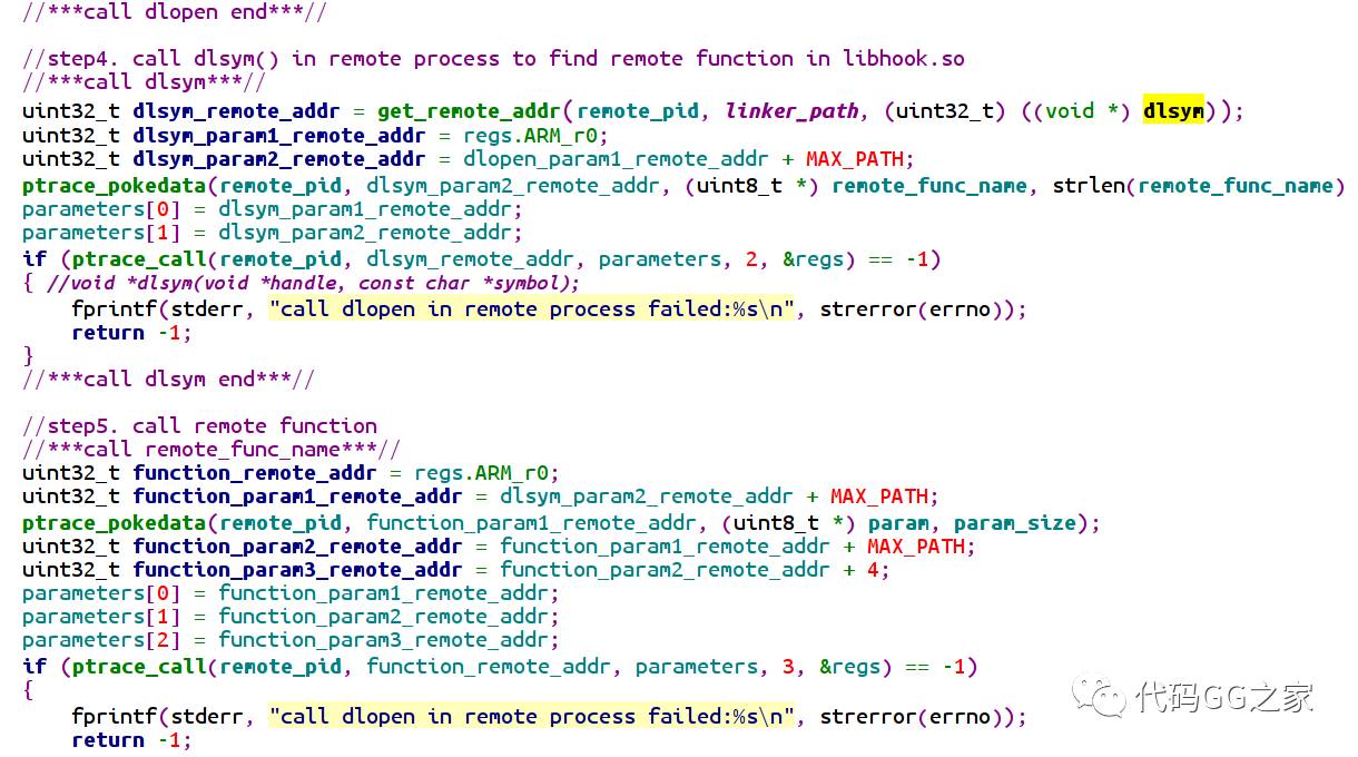 dlsym_remote_addr = get_remote_addr(xxx,dlsym) 去查找dlsym方法在远程进程的地址