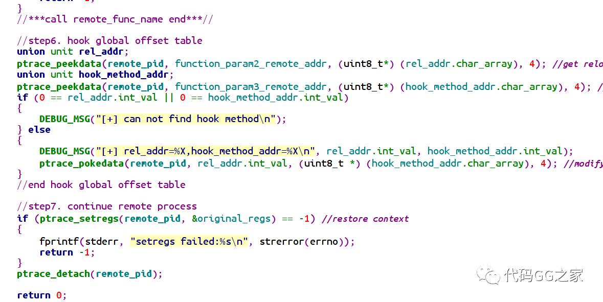 PatchRemoteGot 到远端进程里面,去找下当前传入的要注入的elf文件,原始要替换的方法(printf),从elf文件的符号地址里面,解析出来printf的GOT位置,在此处将hook的地址写入,完成hook