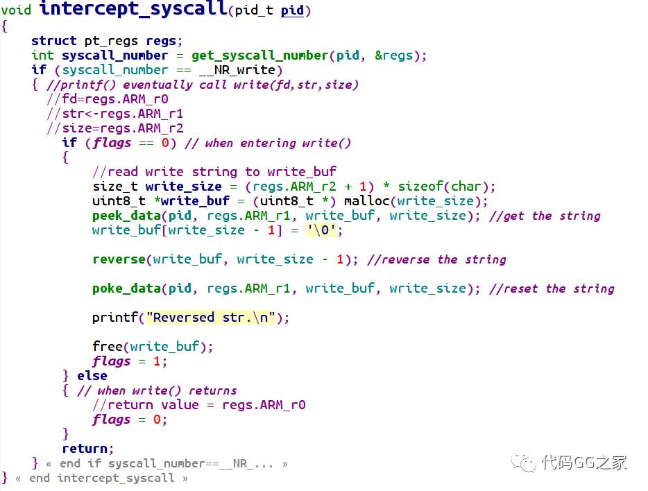 如果syscall_number == __NR_write ,拿到这里的寄存器信息,拿到对应的字串(peek_data),修改后(reverse),回写回去(poke_data)如此,则完成了hook syscall
