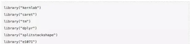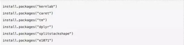我们将使用R语言的“caret”、“tm”和“kernlab”包来解析和读取数据,然后进行模型训练。如果你没装这些包,请用下面的命令安装。