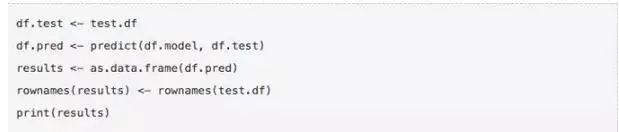 以上代码表示,预测模型在测试数据上运行并输出结果”results”。然后,我们使用原始数据行名作为预测结果向量行名,并最终生成测试数据的预测结果。