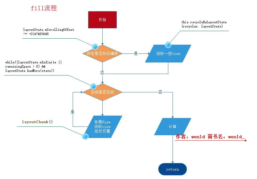 可以看到 layoutChunk()中赋值layoutChunkResult,在之后偏移量添加layoutState.mOffset+=...,剩余空间减去了view消耗的数量 remainingSpace-= layoutChunkResult.mConsumed。