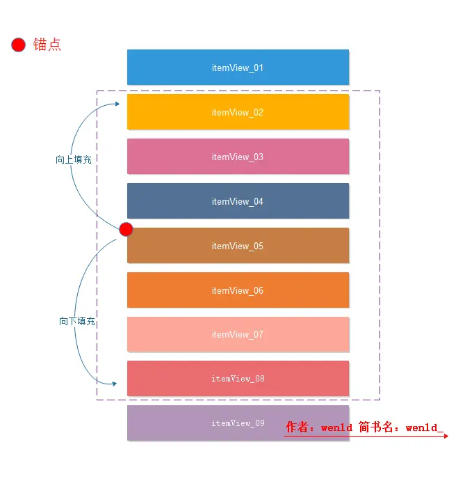 从以上流程中我们了解到了layoutManager的一些布局的规则,我们的布局都是通过一个基准点来进行上下布局,那么最重要的肯定就是这个基准点即锚点的位置。