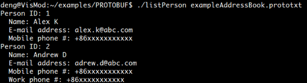 1 int fd = open(argv[1], O_RDONLY); 2 FileInputStream* input = new FileInputStream(fd); 3 if (!google::protobuf::TextFormat::Parse(input, &address_book)) { 4 cerr << "Failed to parse address book." << endl; 5 }这一段代码将input解析为我们设计的数据格式,写入到address_book中。之后再调用ListPeople函数输出数据,来验证数据确实是按照我们设计的格式来存储和读取的。ListPeople函数中使用了之前提到的各个getter接口函数。