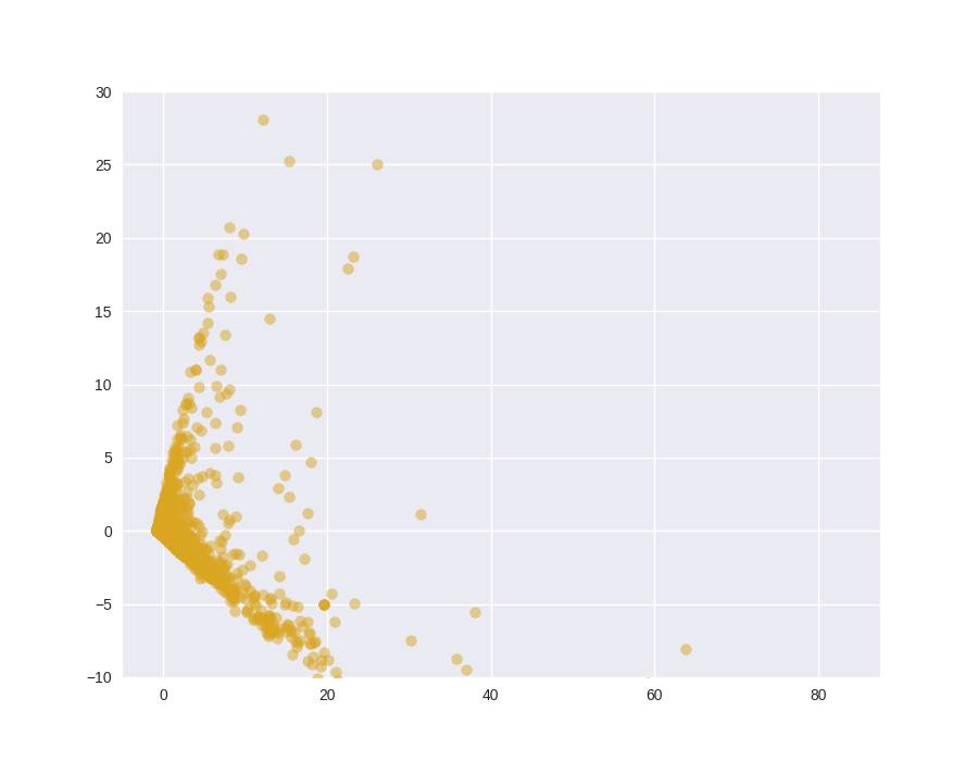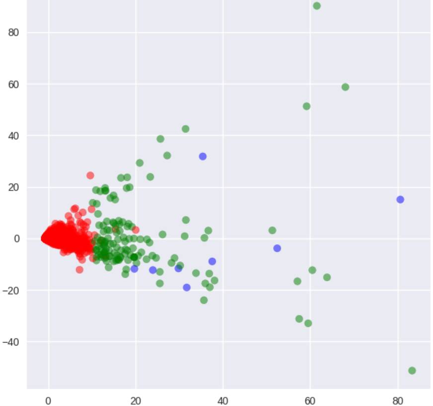 这里我们甚至没有真正观察到聚类的些微轮廓,所以我们很可能应该继续调节 n_component 的值直到我们得到我们想要的结果。这就是数据科学与艺术(data science and art)中的「艺术」部分。