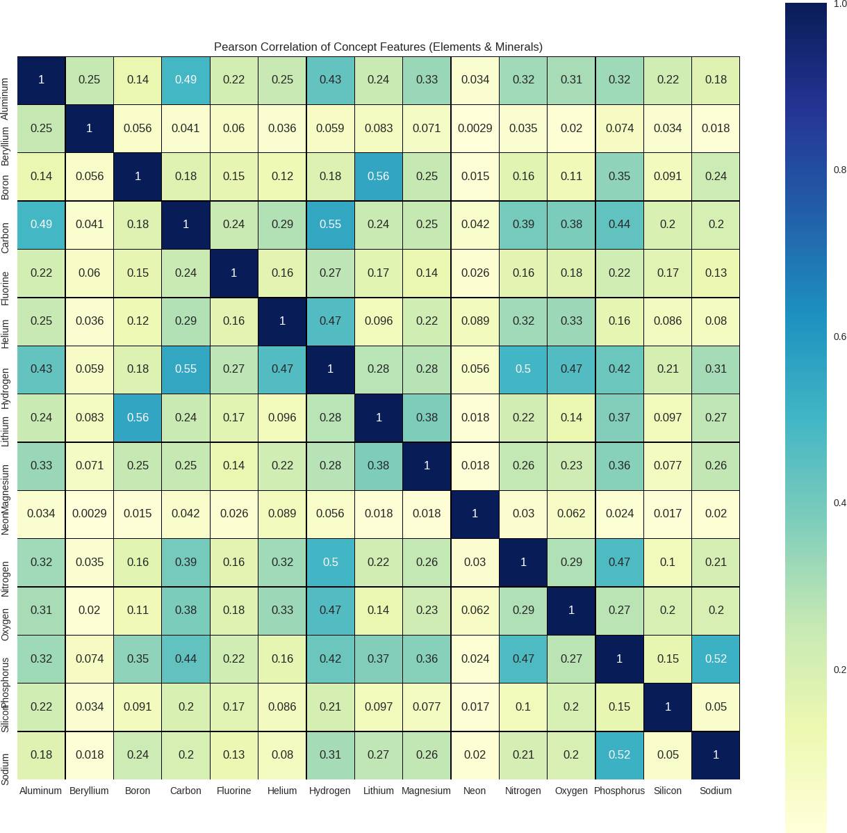 概念特征的皮尔逊相关性(Pearson Correlation)。在这里案例中,是指来自元素周期表的矿物和元素: