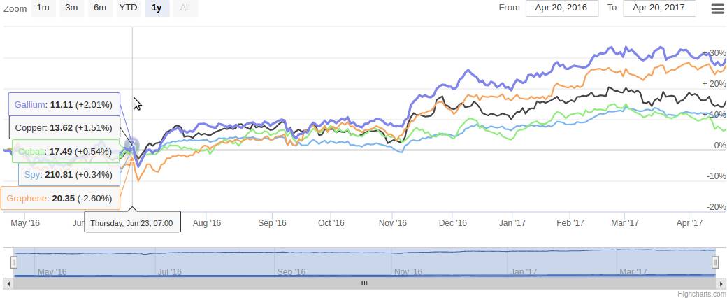 我仅仅使用该数据集操作了 Cobalt(钴)、Copper(铜)、Gallium(镓)和 Graphene(石墨烯)这几个列标签,只是为了看我是否可能发现从事这一领域或受到这一领域的风险的上市公司之间是否有任何隐藏的联系。这些篮子和标准普尔的回报进行了比较。