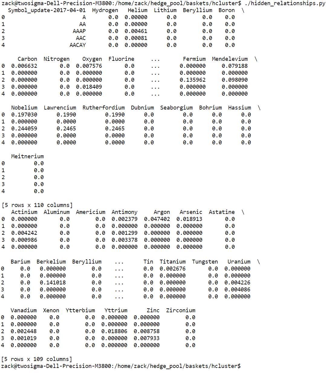 我的一个目标是创建长的和短的股票聚类,我称之为「篮子聚类(basket clusters)」,我可以将其用于对冲或单纯地从中获利。这需要使用一个无监督机器学习方法来创建股票的聚类,从而使这些聚类之间有或强或弱的关系。这些聚类将会翻倍作为我的公司可以交易的股票的「篮子(basket)」。
