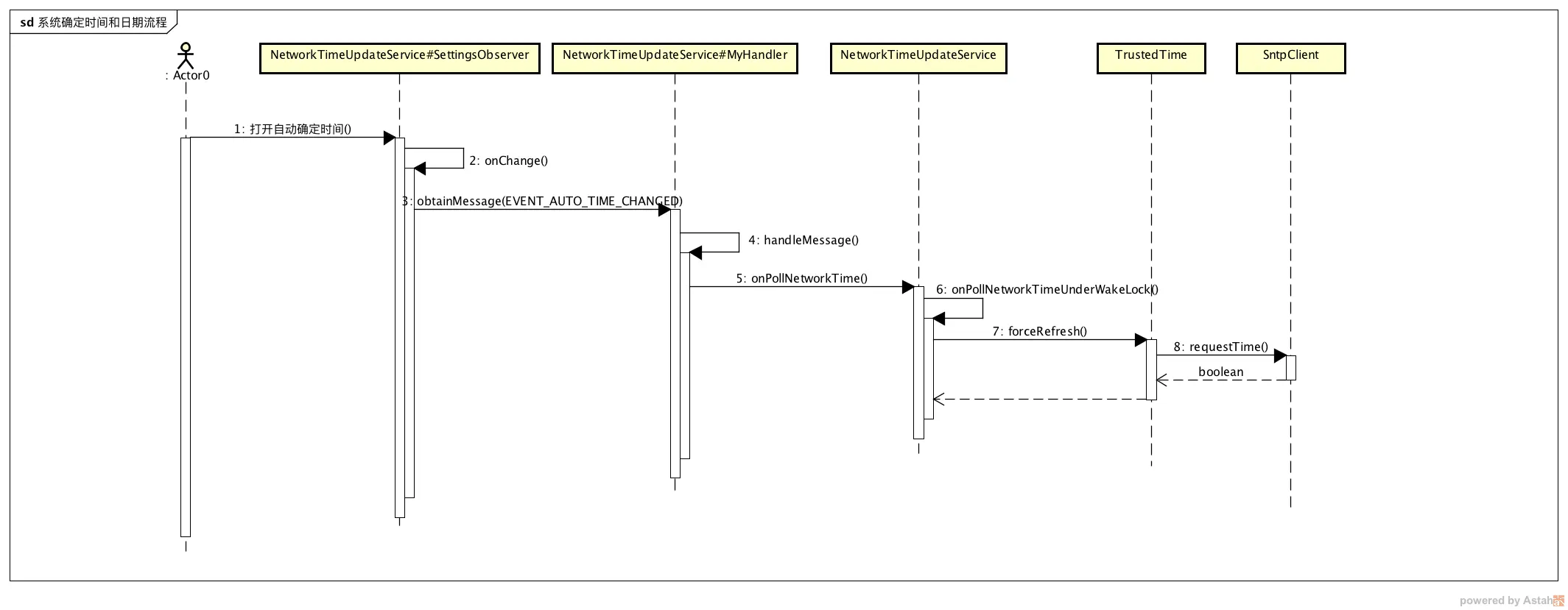 上面是 NetworkTimeUpdateService 类的描述,就是用来保持系统时间和网络时间的同步的,并且有更新失败重试的机制,如果用户打开自动更新时间,优先会使用 NITZ(Network Identity and Time Zone) 机制来更新时间,而后才是 NTP(Network Time Protocol)