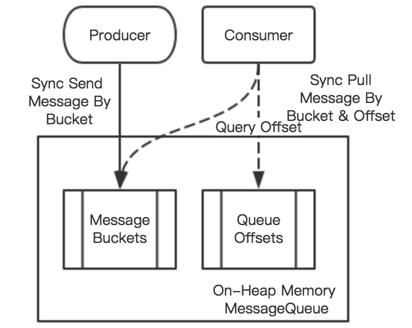 而 MemoryMessageQueue 的 pullMessage 函数则首先判断目标 Bucket 是否存在,并且根据内置的 queueOffset 中记录的拉取偏移量来判断是否拉取完毕。若没有拉取完毕则返回消息并且更新本地偏移量;