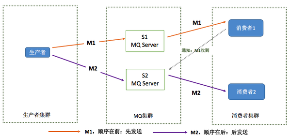 消息产品的一个重要特性是顺序保证,也就是消息消费的顺序要与发送的时间顺序保持一致;在多发送端的情况下,保证全局顺序代价比较大,只要求各个发送端的顺序有保障即可; 举个例子 P1 发送 M11, M12, M13,P2 发送 M21, M22, M23,在消费的时候,只要求保证 M11, M12, M13(M21,M22,M23)的顺序,也就是说,实际消费顺序为: M11, M21, M12, M13, M22, M23 正确; M11, M21, M22, M12, M13, M23 正确 M11, M13, M21, M22, M23, M12 错误,M12 与 M13 的顺序颠倒了;假如生产者产生了 2 条消息:M1、M2,要保证这两条消息的顺序,最直观的方式就是采取类似于 TCP 中的确认消息: