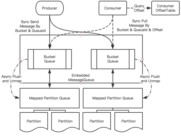 EmbeddedMessageQueue 的主要流程为生产者同步地像 Bucket Queue 中提交消息,每个 Bucket 可以视作某个主题(Topic)或者队列(Queue)。而 EmbeddedMessageQueue 还包含着负责定期将 MappedPartitionQueue 中数据持久化写入到磁盘的异步线程,该线程会定期地完成 Flush 操作。EmbeddedMessageQueue 假设某个 BucketQueue 被分配给某个 Consumer 之后就被其占用,该 Consumer 会消费其中全部的缓存消息;每个 Consumer 会包含独立地 Consumer Offset Table 来记录当前某个队列地消费情况。EmbeddedMessageQueue 的缺陷在于:
