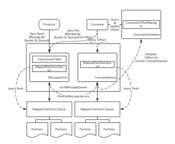 LocalMessageQueue 最大的变化在于将消息统一存储在独立地 MessageStore 中(类似于 RocketMQ 中的 CommitLog),然后针对 Topic-queueId 将消息划分到不同的 ConsumeQueue 中;这里的 queueId 是由对应的 Producer 专属编号决定的,每个 Consumer 即会被分配占用某个 ConsumeQueue(类似于 RocketMQ 中的 consumequeue),从而保证某个 Producer 生产的某个主题下的消息被专一的 Consumer 消费。LocalMessageQueue 同样使用 MappedPartitionQueue 提供底层文件系统抽象,并且构建了独立的 ConsumerOffsetManager 对消费者的消费进度进行管理,从而方便异常恢复。