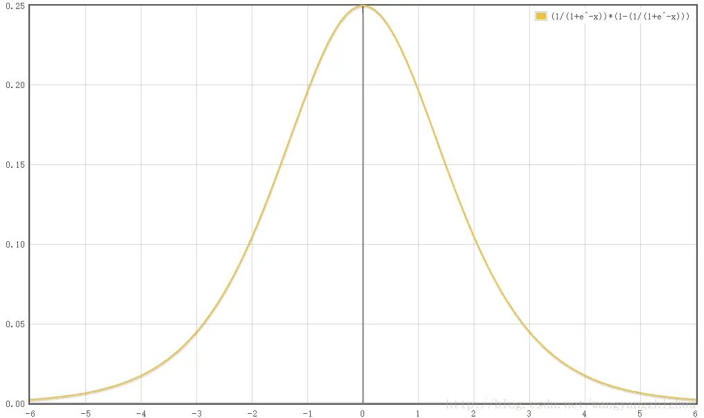 则梯度下降法更新权重时,会涉及到sigmoid函数的导数,这个导数的形状大致如下: