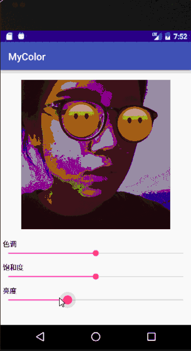 下面,通过一个demo来给大家看看,修改色调、饱和度、亮度的效果。首先我们看看效果图,如下: