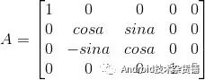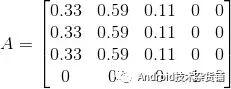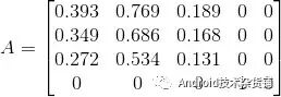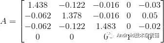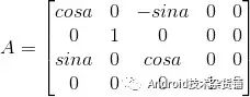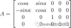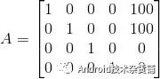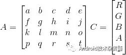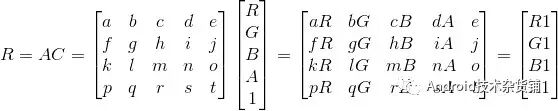 在Android中,系统使用一个颜色矩阵——ColorMatrix,来处理图像的色彩效果。对于图像的每个像素点,都有一个颜色分量矩阵用来保存颜色的RGBA值(下图矩阵C),Android中的颜色矩阵是一个 4x5 的数字矩阵,它用来对图片的色彩进行处理(下图矩阵A)。 如下: