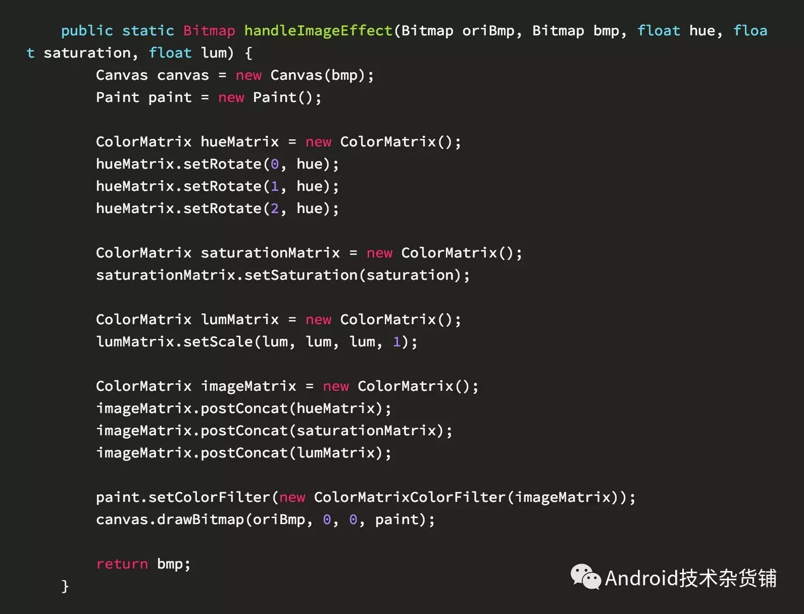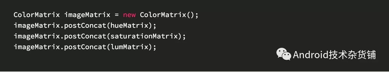 在Android 的 ColorMatrix 颜色矩阵中也封装了一些 API 来快速调整上面这三个颜色参数,而不用每次都去计算矩阵的值。