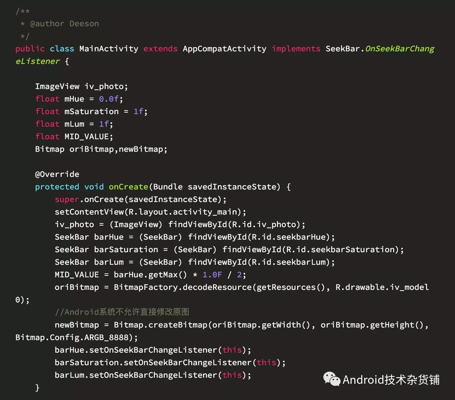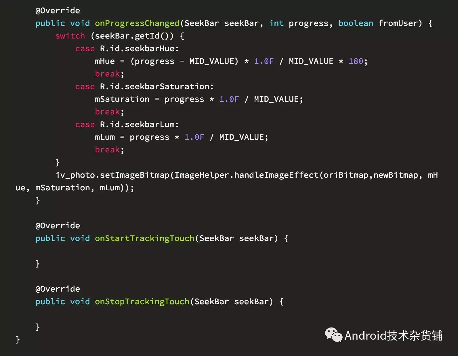 这里的 demo 通过滑动三个 SeekBar 来改变不同的值,并将这些数值作用到对应色调、饱和度、亮度的颜色矩阵中,最后通过 ColorMatrix 的 postConcat() 方法来混合这三个被修改的颜色矩阵的显示效果。关键设置图像矩阵的代码如下: