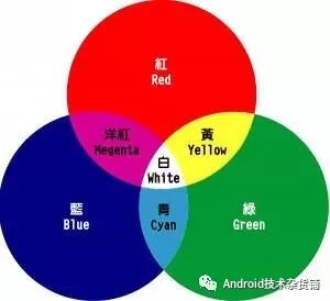 Android对于图片的处理,最常使用到的数据结构是位图——Bitmap,它包含了一张图片所有的数据。整个图片都是由点阵和颜色值组成的,所谓点阵就是一个包含像素的矩阵,每一个元素对应着图片的一个像素。而颜色值——ARGB,分别对应着透明度、红、绿、蓝这四个通道分量,他们共同决定了每个像素点显示的颜色。上图显示的就是色光三原色。