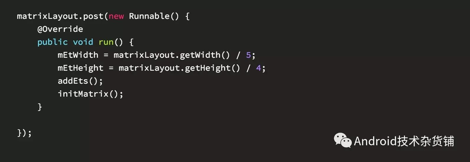 在 MainActivity 类这里有一个地方要注意的就是,我们无法在 onCreate() 方法中获得 4x5 矩阵视图的宽高值,所以通过 View 的 post() 方法,在视图创建完毕后获得其宽高值。如下: