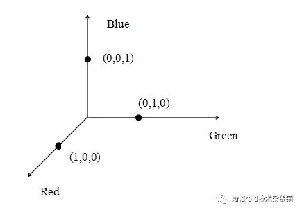 Android系统的 setRotate(int axis, float degrees) 方法其实就是对色彩的旋转运算。RGB色是如何旋转的呢,首先用R、G、B三色建立三维坐标系,如下:
