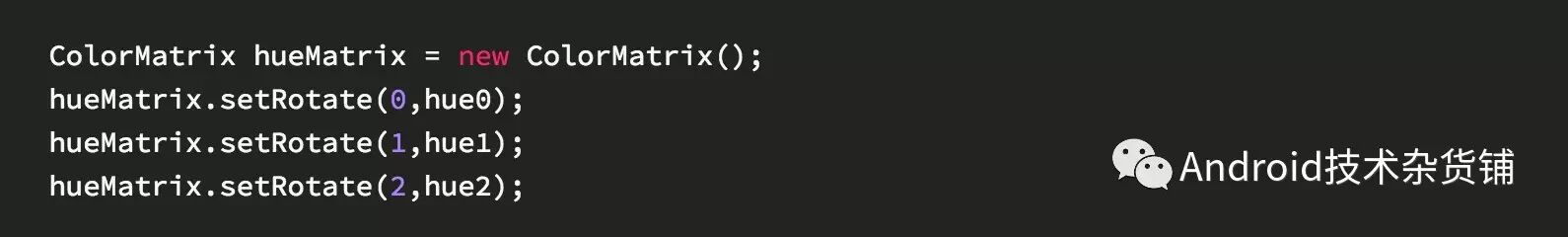 Android系统提供了 setRotate(int axis, float degrees)方法来修改颜色的色调。第一个参数,用0、1、2分别代表红、绿、蓝三个颜色通道,第二个参数就是要修改的值,如下: