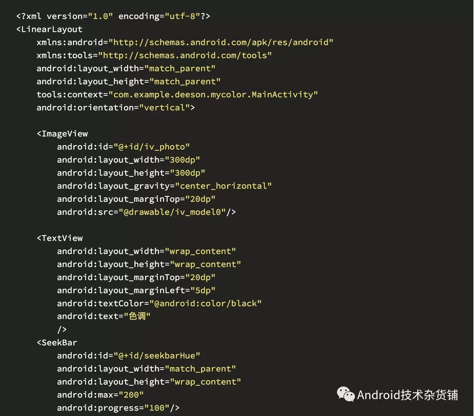 接下来我们看看这个demo的xml代码,很简单,一个 ImageView ,三个 SeekBar ,如下: