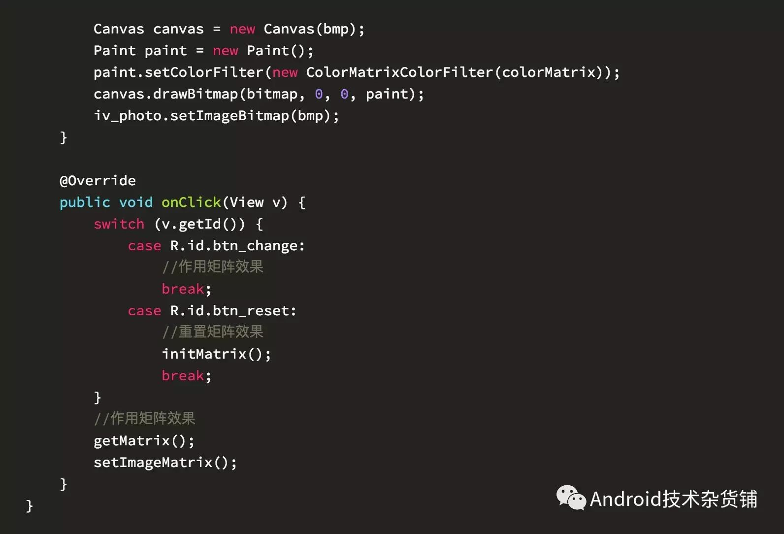 在设置好需要处理的颜色矩阵后,通过使用 Paint 类的 setColorFilter() 方法,将通过 imageMatrix 构造的 ColorMatrixColorFilter 对象传递进去,并使用这个画笔来绘制原来的图像,从而将颜色矩阵作用到图像中。