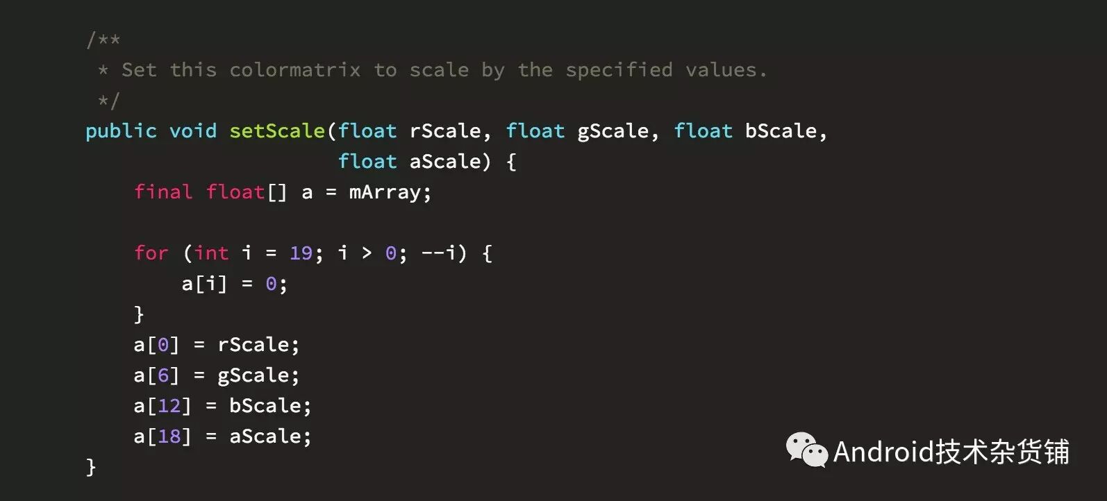 同样贴出修改亮度值的源码,当亮度为 0 时,图像就变成全黑了。通过对源码的阅读,我们可以知道, 系统将颜色矩阵置为初始初始颜色矩阵,再将红、绿、蓝、透明度四个分量通道对应的系数修改成我们传入的值。