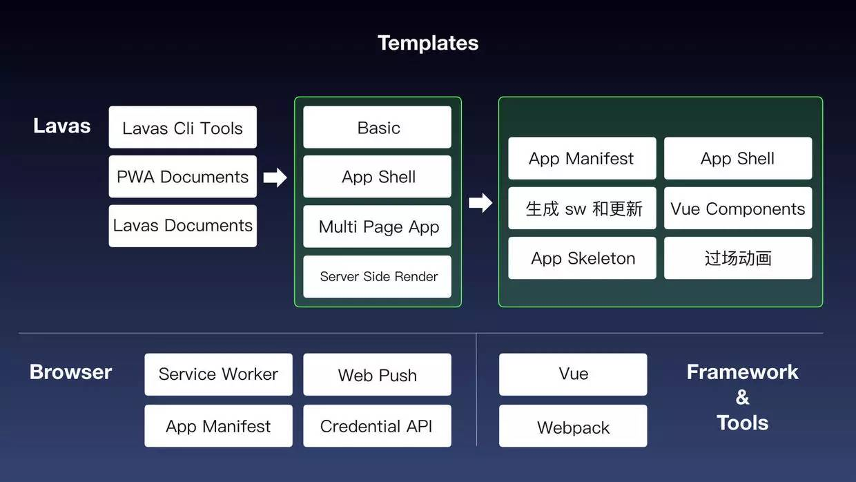 Lavas 提供了四套基于 Vue 和 webpack 的模板,Basic,App Shell,多页应用,服务器端渲染,以满足开发者不同的需求,帮助开发者解决开发 PWA 遇到的诸多问题,让开发 PWA 只需一条命令。
