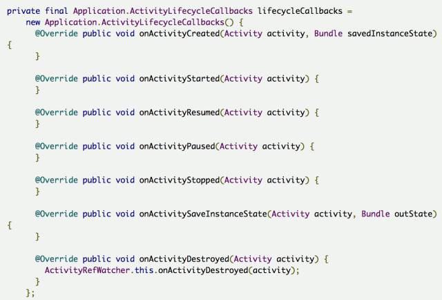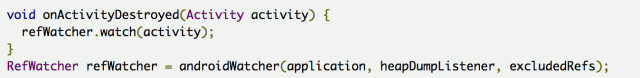 另外,如果不想监控某些特殊的活动,那么可以在onActivityDestroyed(Activity activity)里,过滤掉特殊的活动,只对其它活动调用refWatcher.watch(activity )监控。